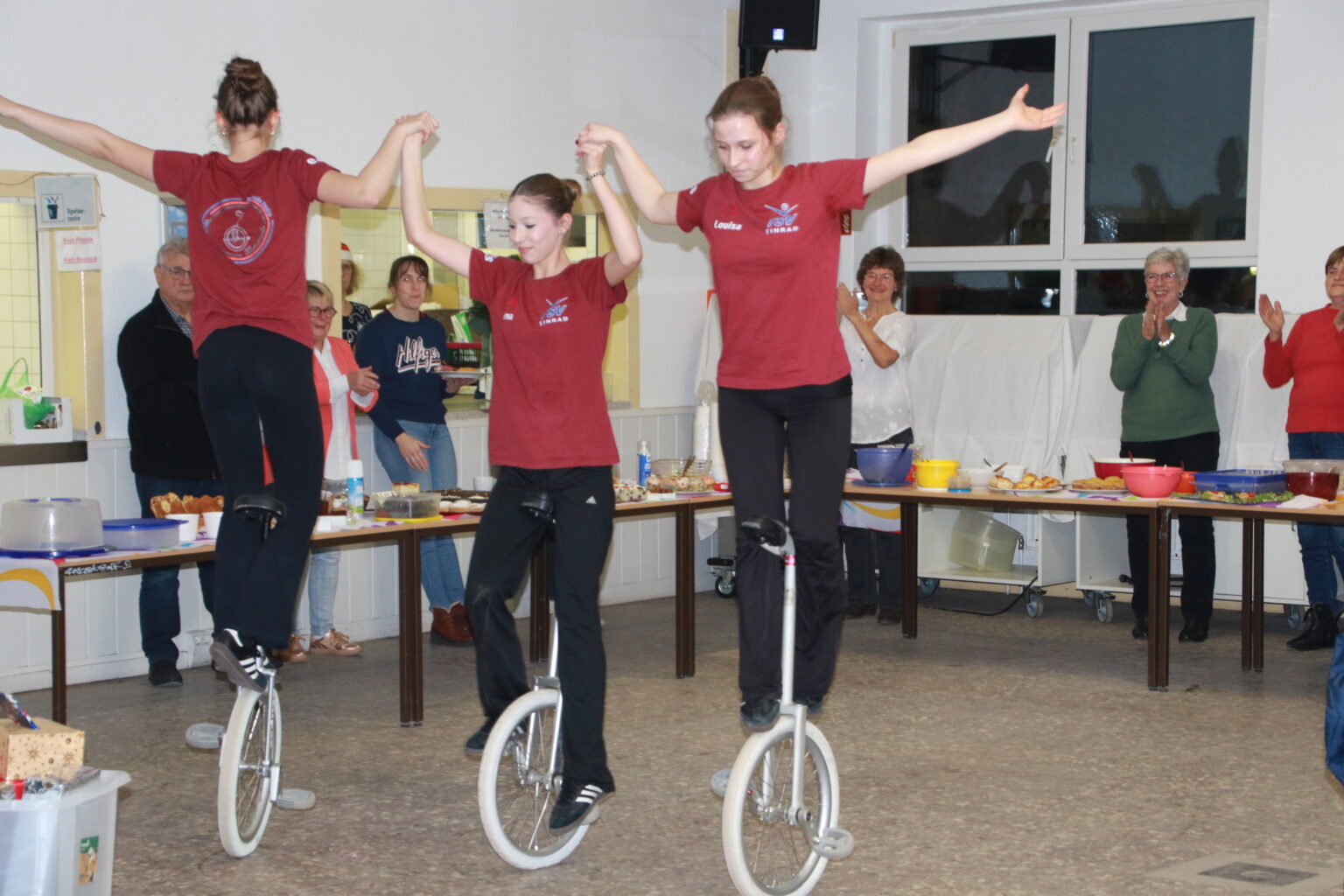 Ein Highlight war wieder mal der Auftritt der Einrad-Mädchen. Die Zuschauer waren fasziniert von deren Leistungen, so dass so lange applaudiert wurde, bis sie uns eine Zugabe ihres Könnens zeigten.
