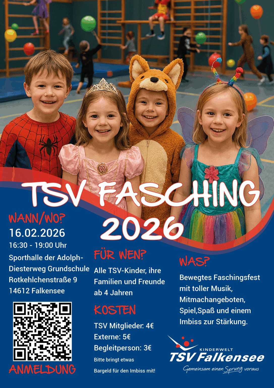 Wir Hoffen ihr kommt in euren buntesten Kostümen und Euch erwartet ein bewegtes Faschingsfest mit toller Musik, mit Spiel- und Spaßstationen, sowie ein Imbiss zur Stärkung nach dem ganzen Toben.