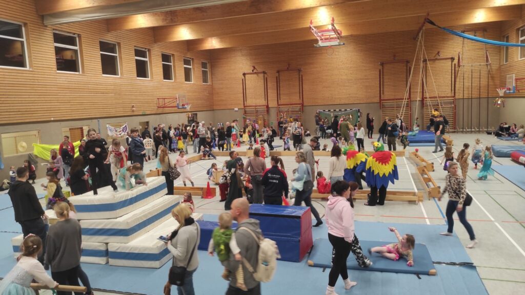 In der Halle erwartete die Teilnehmenden ein abwechslungsreiches Bewegungsangebot. Ein vielseitiger Parkour lud zum Klettern, Balancieren und Ausprobieren ein. Auf dem Rollbrettfeld konnten die Kinder ihr Geschick unter Beweis stellen, während das große Trampolin und die AirTrack für schwungvolle Sprünge sorgten. Auch die Schaukeln wurden mit Begeisterung genutzt und rundeten das sportliche Angebot ab.